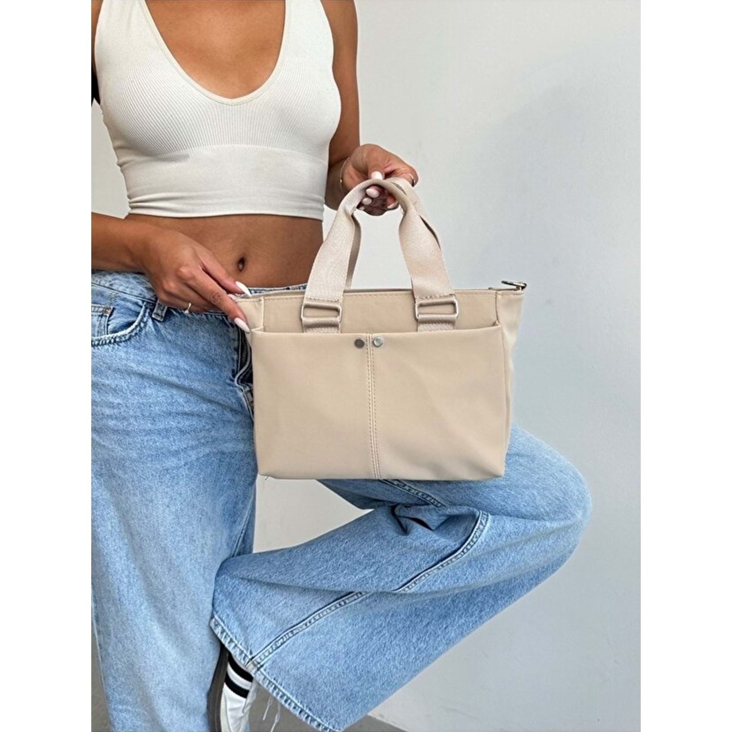 1070 Kadın Saten Çok Cepli Çapraz El ve Omuz Çantası - KREM