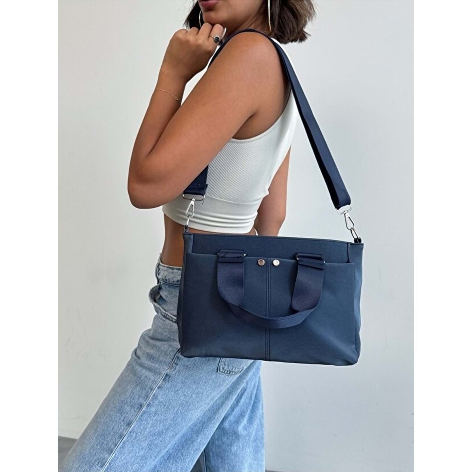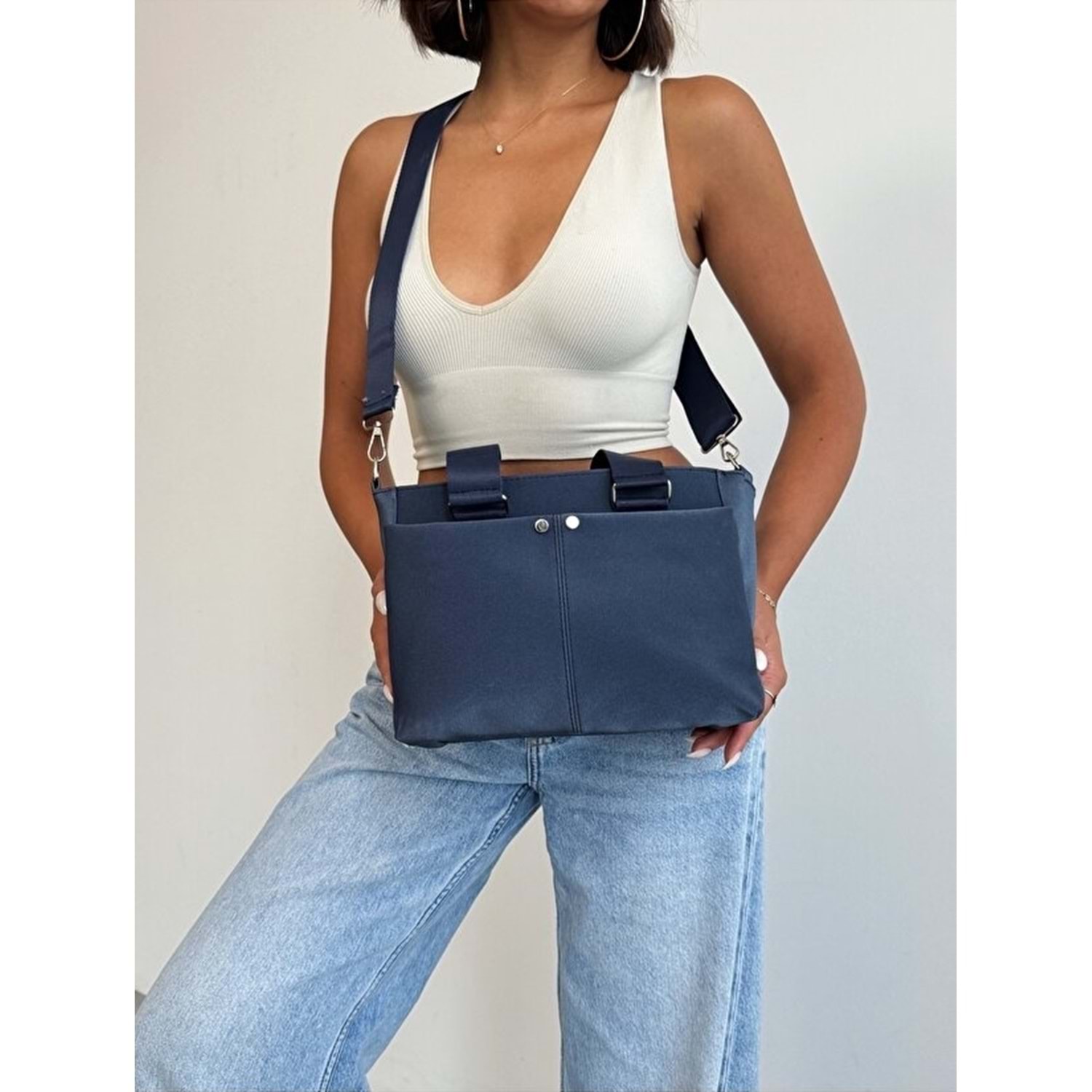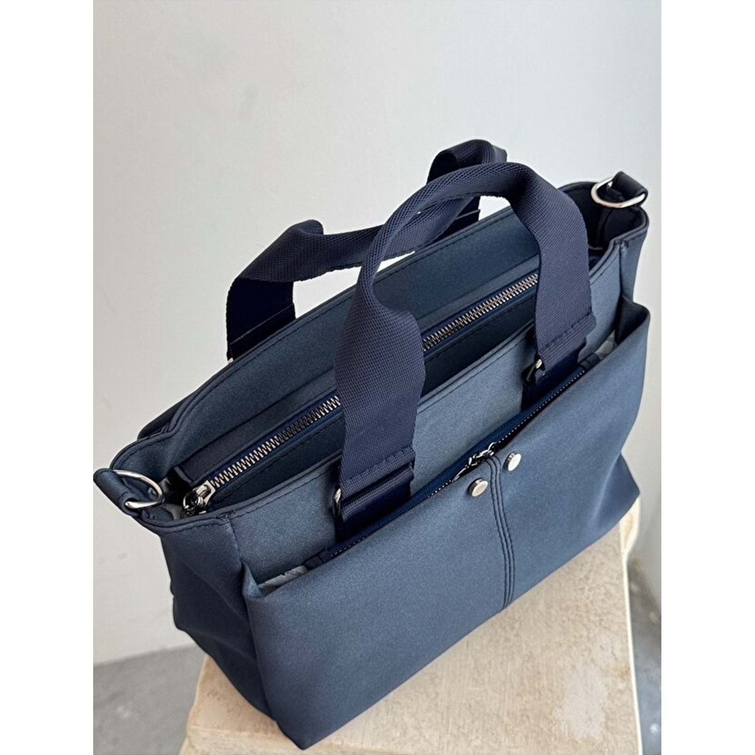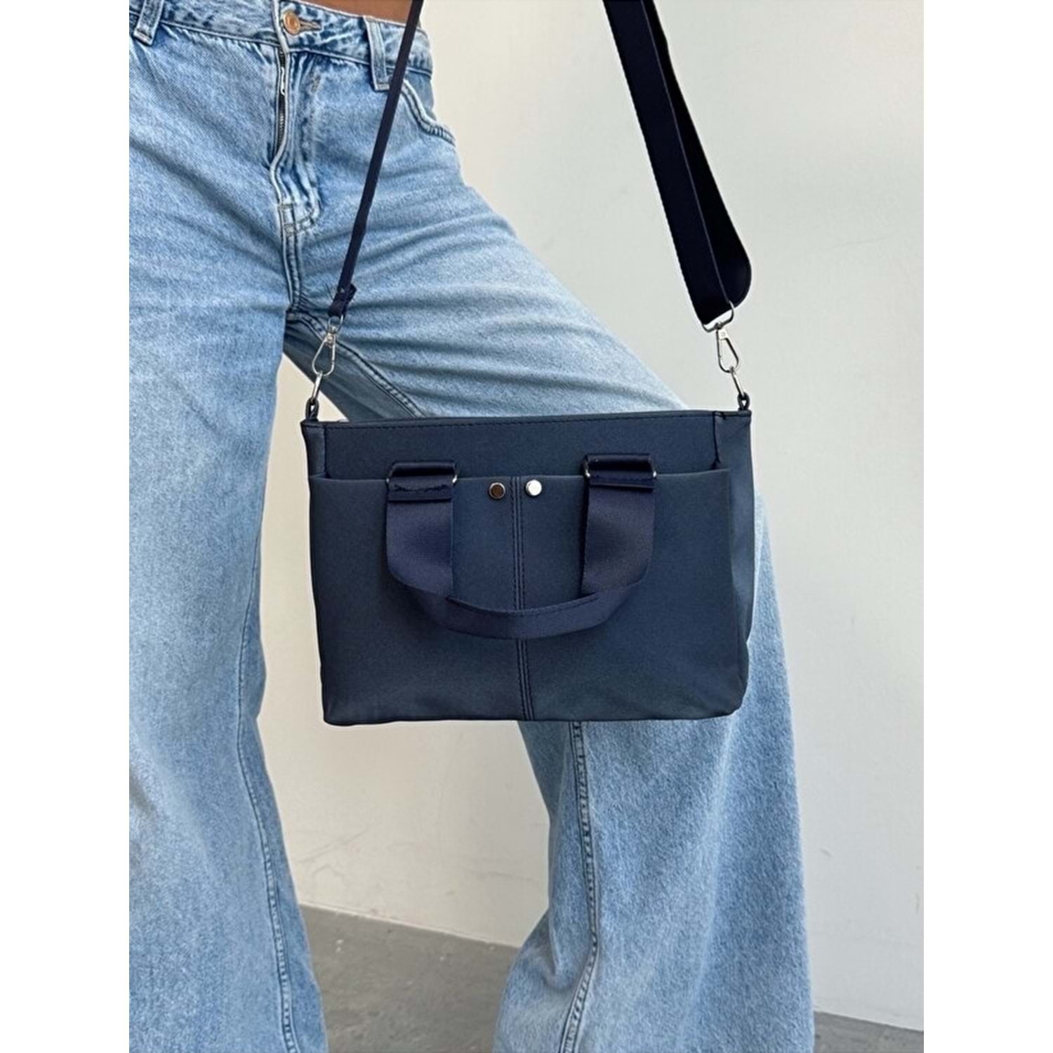 1070 Kadın Saten Çok Cepli Çapraz El ve Omuz Çantası - LACİVERT